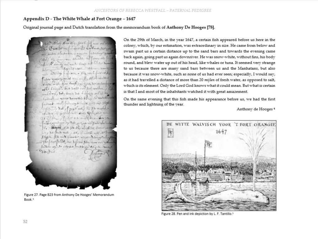 One of the great pleasures of the Westfall project was finding Dirk Mouw’s book The Memorandum Book of Anthony De Hooges which provides English translations of the many notes the young De Hooges recorded while at the Rensselaerswyck colony. One of my favorites was a 1647 note about seeing a white whale in the Hudson river.